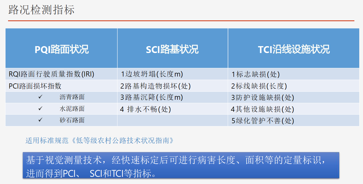 | 檢測設(shè)備:激光平整度儀器、工業(yè)相機(jī)、GNSS采集裝置 | 檢測設(shè)備:激光平整度儀、路況綜合采集箱 |